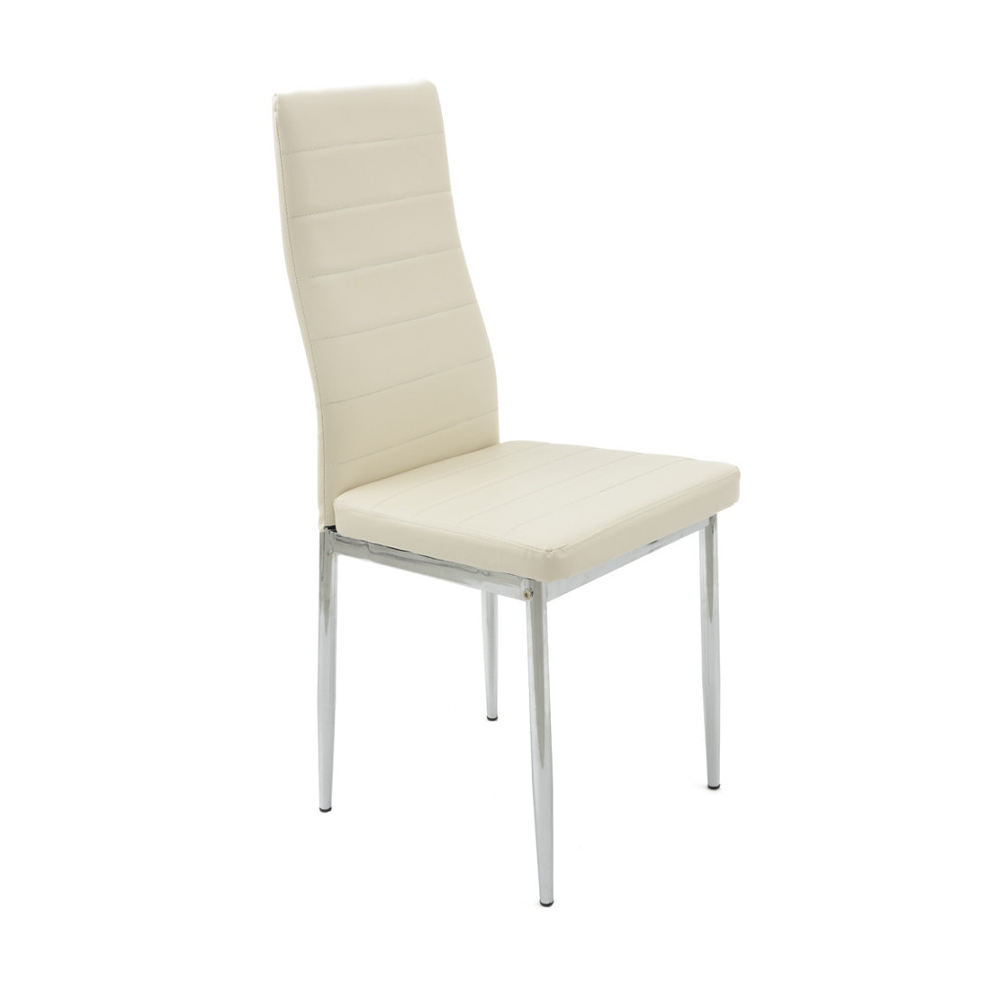 Scaun de bucatarie de culoare crem. Scaunul are un format ergonomic si un design clasic. Cusaturile de pe spatar dar si cele de pe sezut ii confera rezistenta tapiteriei si o senzatie de confort, astfel nedeformandu-se datorita utilizarii intense. Tapiteria este din piele ecologica cu cusaturi la culoarea pielii. Cadrul este din metal cromat si prezinta dopuri de plastic la contactul cu pardoseala, protejand parchetul sau gresia. Cadrul este sudat, sarcina de testare este de 100 kg. Produsul necesita montaj.