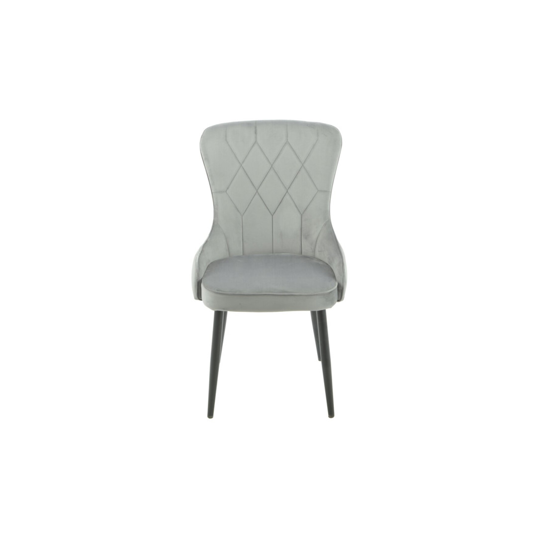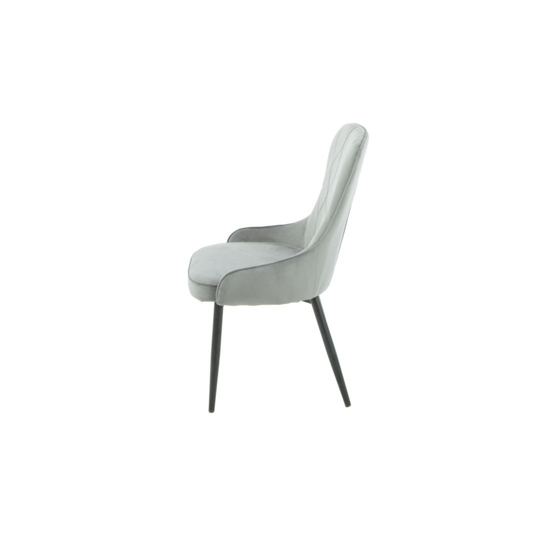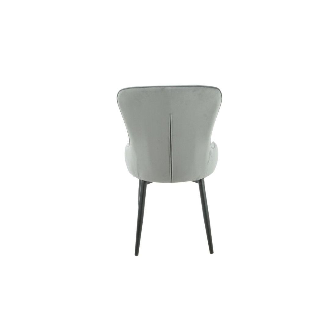 Scaunul Frida impresionează prin liniile elegante și atenția la detalii. Șezutul și spătarul sunt tapițate cu stofă tip catifea gri, oferind o textură plăcută și un aspect rafinat. Structura robustă din metal și lemn stratificat, cu picioare metalice negre, asigură stabilitate și durabilitate pe termen lung.