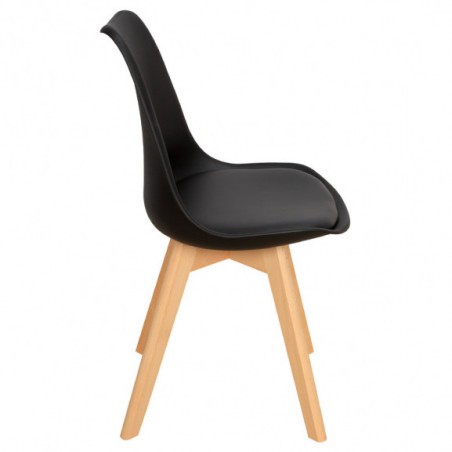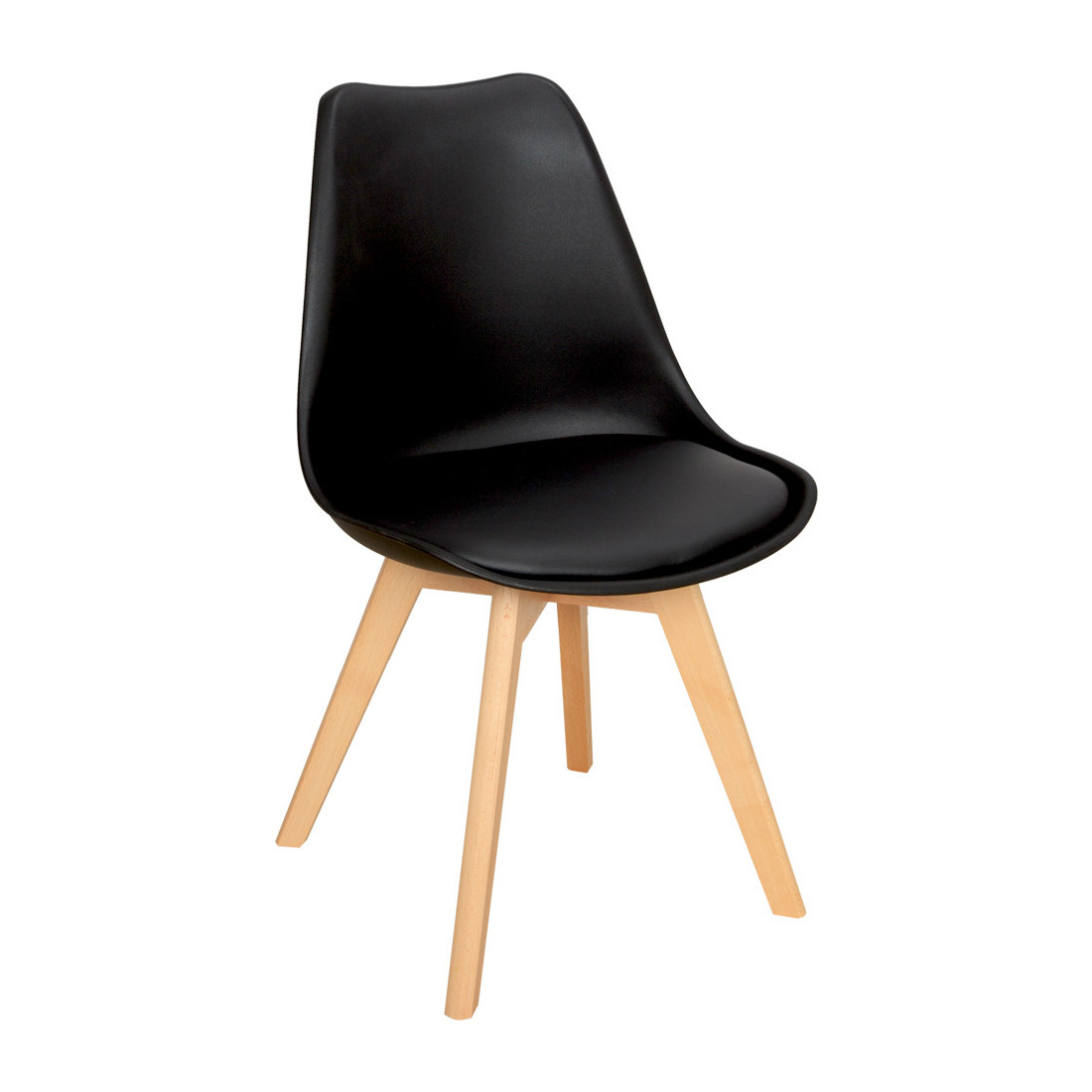 Material: Cadru si picioare din lemn de fag; Sezut si spatar din PP alb; Perna sezut confort tapitata in piele ecologica neagra.