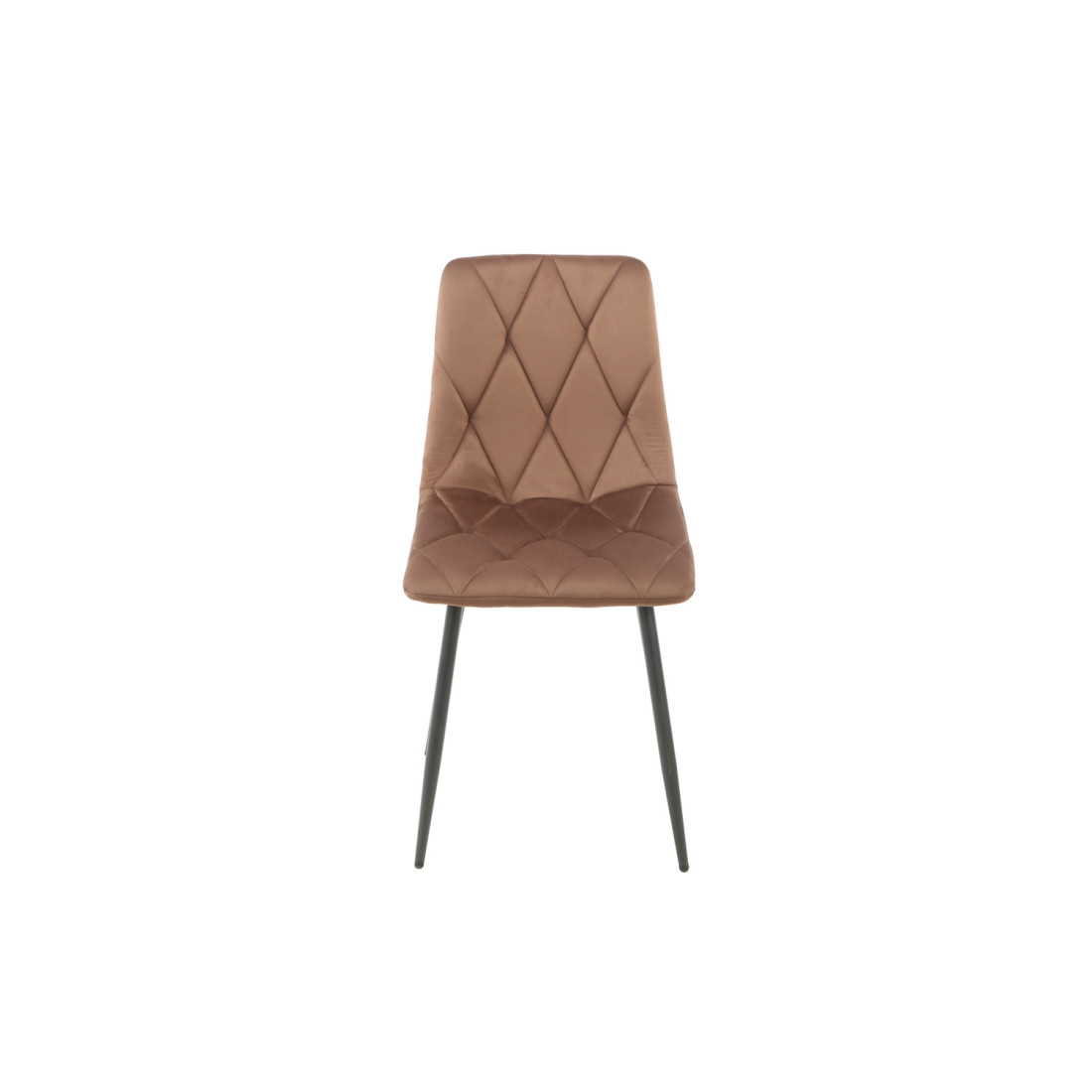 Scaunul Sirius combină liniile moderne cu forme ergonomice, oferind un șezut confortabil și spătar care susține corect postura. Tapițeria din stofă tip catifea maro adaugă o textură plăcută și un aspect sofisticat, în timp ce structura metalică neagră conferă stabilitate și durabilitate.