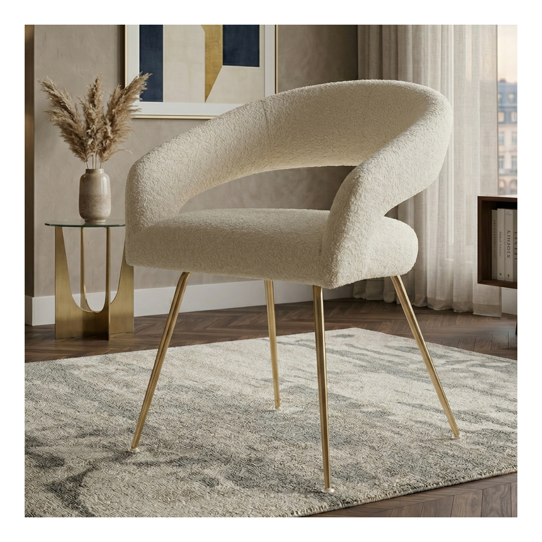 Transformă-ți spațiul într-un sanctuar al rafinamentului cu scaunul Solaris Beige Boucle. Această piesă de mobilier îmbină perfect una dintre cele mai apreciate texturi ale designului contemporan — stofa tip boucle — cu liniile sculpturale și accentele metalice luxoase. Este alegerea ideală pentru cei care caută un echilibru între estetica modernă „quiet luxury” și o senzație de confort absolut, primitor.