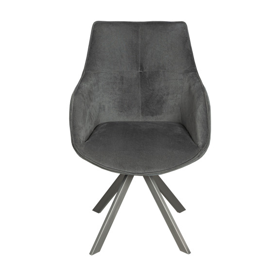 Scaun tapitat realizat din metal, carcasa interioara este din rama de metal si picioare din lemn masiv vopsit in culoarea metalului, confortul este asigurat prin folosirea chingilor elastice si a spumei poliuretanice de inalta rezistenta. Produsul este tapitat cu stofa. Produsul este prevazut cu mencanism rotativ cu auto-return.