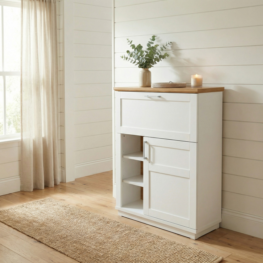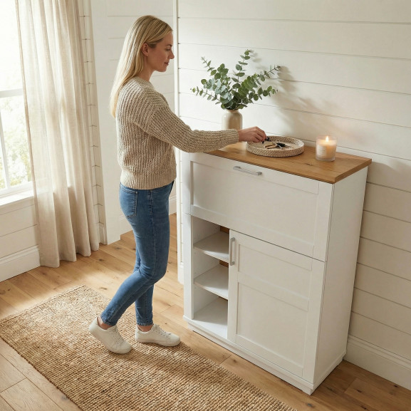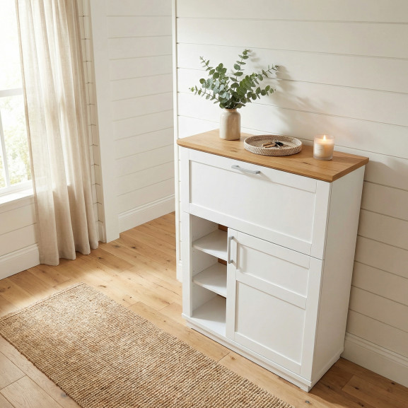 Magia se întâmplă când deschizi ușa superioară rabatabilă: aceasta se transformă într-o suprafață de lucru practică pentru laptop sau agendă. Partea inferioară este dedicată organizării: