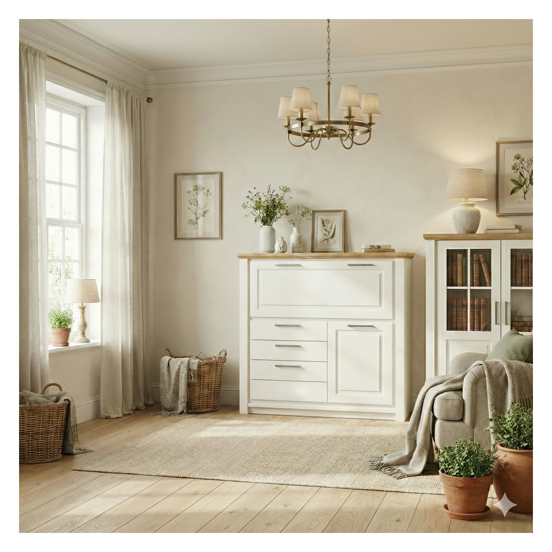 Lucrezi de acasă, dar nu vrei ca biroul să ocupe tot spațiul din living? Secretarul Alpina este soluția ideală care îmbină eleganța unei comode cu utilitatea unui spațiu de lucru complet. Când este închis, arată ca o piesă de mobilier rafinată, finisată în alb mat cu un blat superb din furnir natural de stejar.