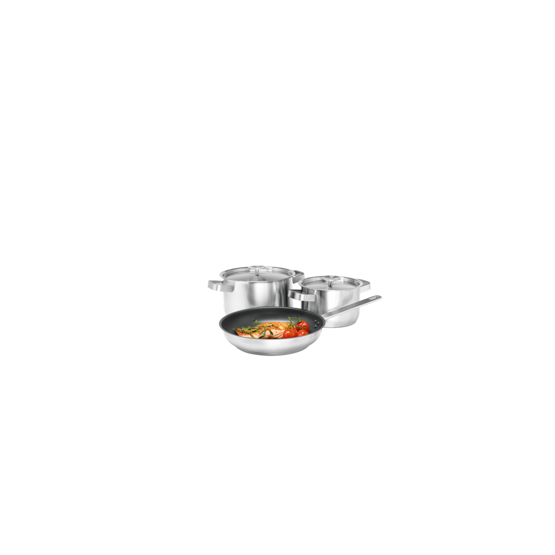 Set de vase din inox ideal pentru gătitul de zi de zi. Acesta include o tigaie cu diametrul de 24 cm și două cratiţe cu diametru de 16 cm, respectiv 20 cm. Este tot ceea ce ai nevoie pentru a crea preparate delicioase în fiecare zi.
