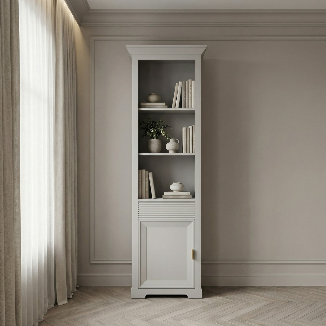 Biblioteca are un rol dublu intr-o incapere, ea ofera un loc de depozitat carti dar si un loc pe care poti sa o personalizezi cu obiecte de decor inedit. Biblioteca Verona Kashmir iti ofera loc pentru toate si un plus de eleganta si originalitate locuintei tale. Biblioteca Verona Kashmir pune accent pe simplitate, abundentă, oferind un aer chic locuintei tale. Cu dimensiunile 65 cm latime, 42 cm adancime si 200 cm inaltime, biblioteca Verona Kashmir cu nuanta sa creeaza o atmosfera primitoare si luminoasa. Cele trei rafturi deschise din partea superioara sunt ideale pentru carti sau obiecte decorative. Sertarul din mijloc are sistem de deschidere/inchidere tip Push To Open, ideal pentru organizarea si accesul rapid catre produse de dimensiuni reduse, iar partea inferioara este prevazuta cu doua rafturi acoperite cu o usa.