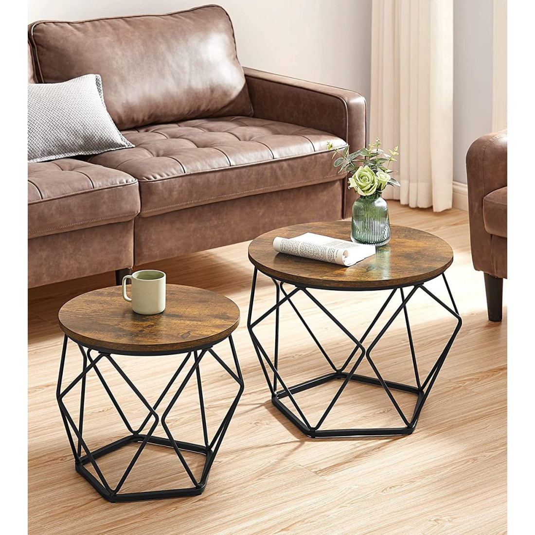 Aceste măsuțe de cafea în stil industrial pentru camera ta de zi aduc o notă specială spațiului tău cu blaturi rotunde rustice maro și baze geometrice din oțel negru. Aspectul lor atractiv iti va impresiona oaspetii.
