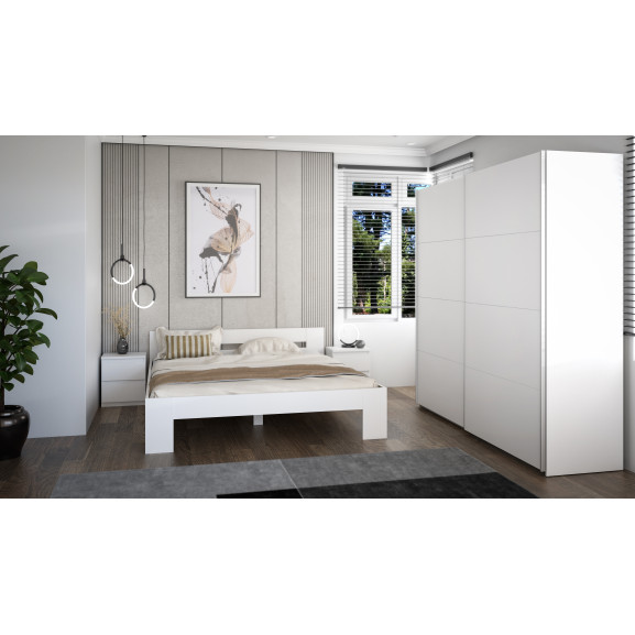 Set Dormitor Praktic, Alb Mat, Dulap 220 Cm, 2 Noptiere Si Pat Cu Dimensiune Saltea 180 x 200 Cm