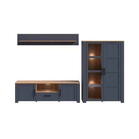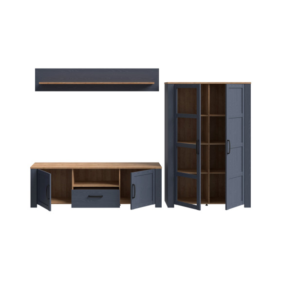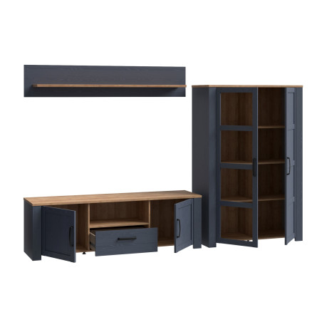 Comoda TV oferă spațiu suficient pentru a-ți aranja echipamentele multimedia, în timp ce vitrina adaugă un element de expoziție pentru obiectele tale preferate. Polița completează setul, oferindu-ți o soluție practică pentru depozitarea cărților, decorațiunilor sau a altor obiecte personale.
