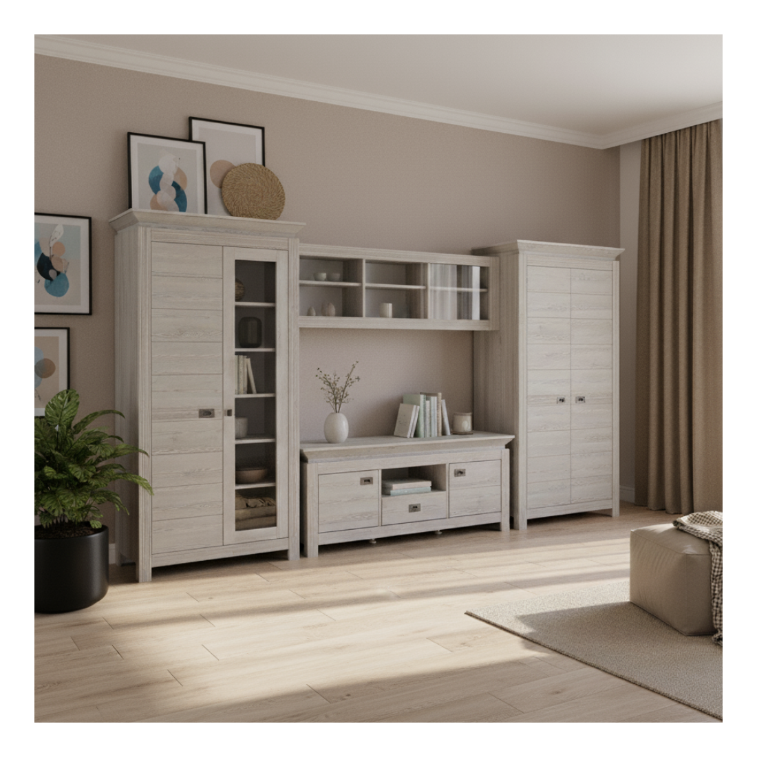 Fiecare piesă din acest set îndeplinește o funcționalitate distinctă, contribuind astfel la un spațiu bine organizat. Dulapul, comoda TV, etajera și vitrina cu 2 uși oferă spațiu generos de depozitare și expunere, iar mecanismul cu închidere silențioasă adaugă o notă de lux în utilizarea zilnică.