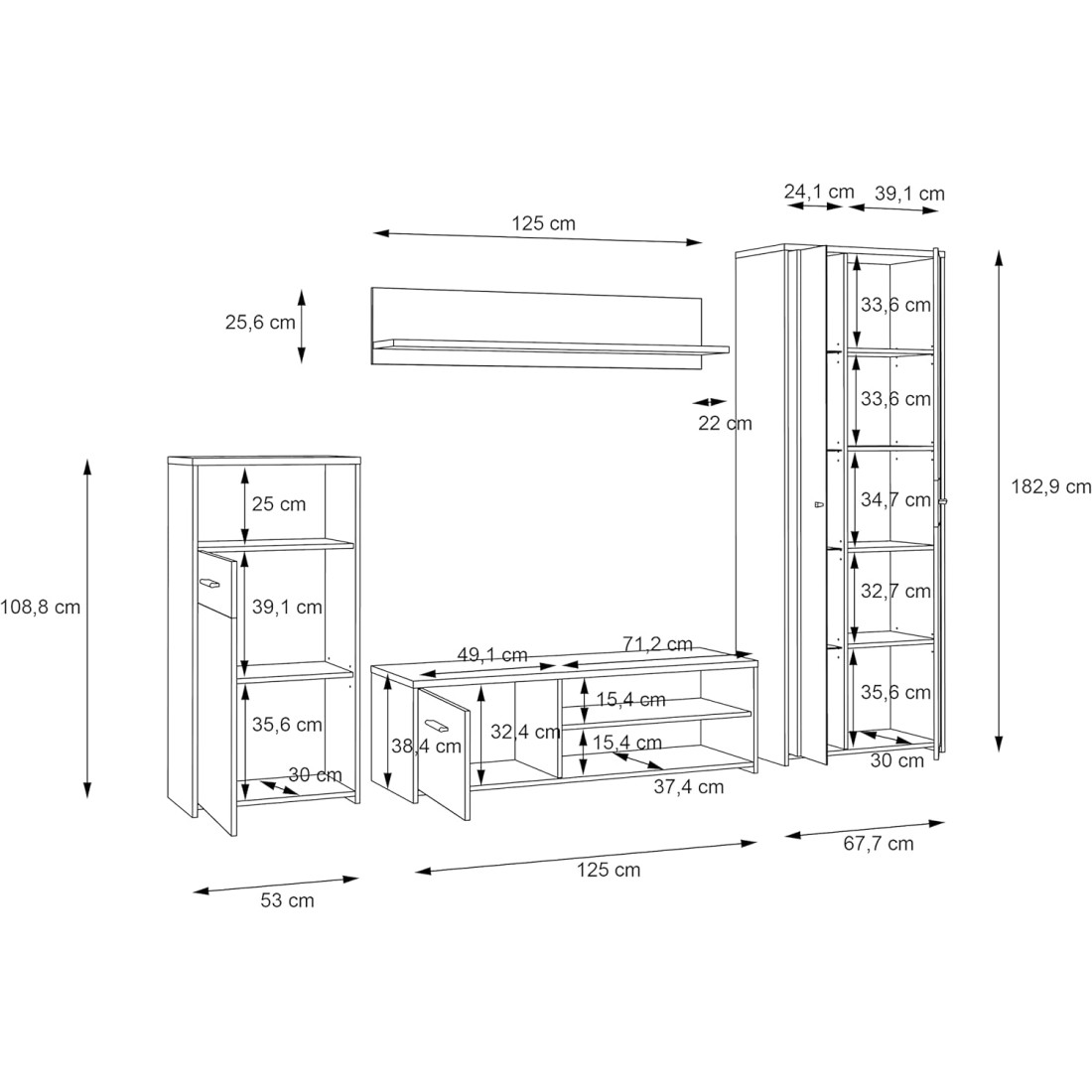 Fiecare piesă a setului îndeplinește un rol distinct și esențial. Comoda TV asigură un spațiu inteligent pentru echipamentele multimedia, în timp ce comoda și vitrina oferă spațiu generos pentru depozitare și expoziție. Polița adaugă un element practic și decorativ în același timp.