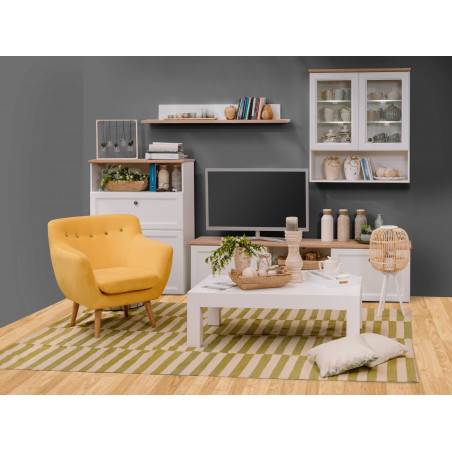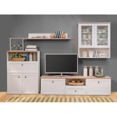Fiecare piesă a acestui set îndeplinește funcționalitatea sa cu eleganță. Comoda TV oferă spațiu generos pentru echipamentele multimedia, în timp ce comoda și vitrina suspendată asigură spațiu de depozitare pentru obiectele tale preferate. Polița adaugă un plus de utilitate, completând armonios întregul ansamblu.