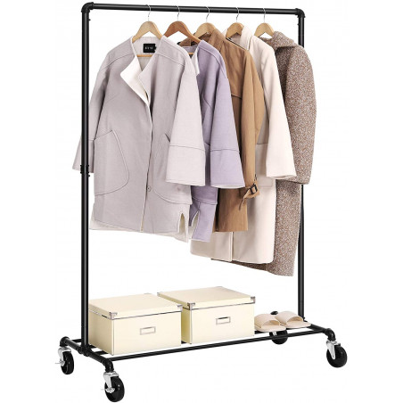 Acest suport de haine va oferi o solutie de depozitare practica si mobila pentru agatarea hainelor.Cu o bara suspendata, cuierul pentru haine este proiectat ca spatiu de depozitare. .Doua dintre roti sunt echipate cu frane, adaugand o stabilitate suplimentara.Datorita celor patru rotite cu alunecare lina de 360 °, suportul pentru haine poate fi deplasat cu usurinta in zona unde aveti nevoie. Cuierul de haine este capabil sa sustina o greutate de pana la 90 de kilograme.