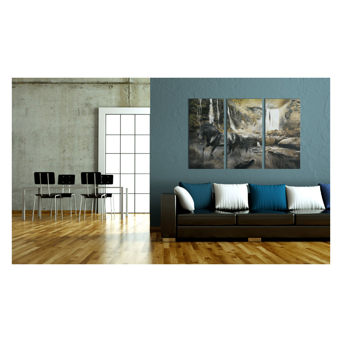 Permiteți tabloului canvas "Black horse and rocky waterfall" să vă schimbe casa și casele celor dragi!