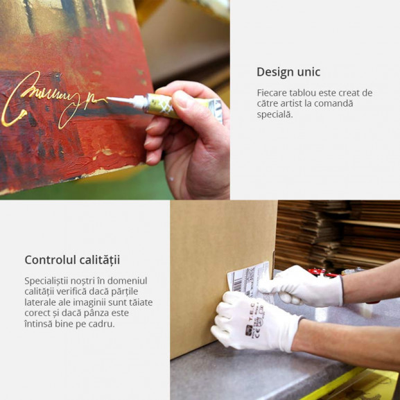 Tablourile pictate manual sunt realizate pe o pânză italiană profesională, care a fost pregătită într-un mod corespunzător și întinsă cu atenție pe un cadru din lemn. Este realizat cu ajutorul vopselelor acrilice profesionale de calitate superioară.