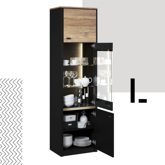 Partea vitrata cu doua rafturi de sticla iti permite sa-ti expune portelanul preferat si sticla inalta, dar si carti si suveniruri. În dulapuri puteți depozita în mod convenabil haine, textile, porțelan și alte articole. Caracterul atractiv al vitrinei este creat de corpul negru combinat cu culoarea expresivă a decorului asemănător lemnului și benzile aurii periate.