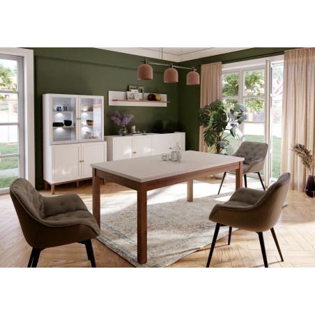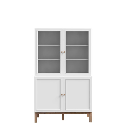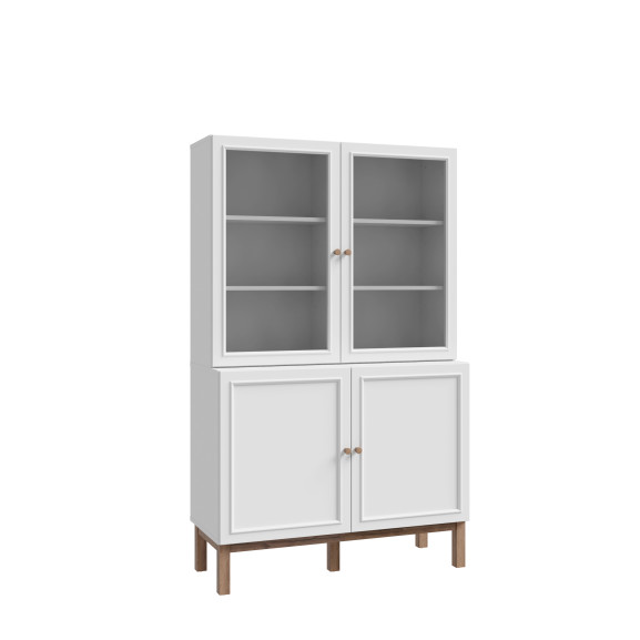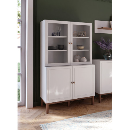 Cu patru uși, această vitrină oferă spațiu de depozitare generos pentru obiectele tale preferate. Ușile cu închidere "soft" asigură o închidere lină și silențioasă, iar mânerele din lemn adaugă un finisaj elegant și modern.