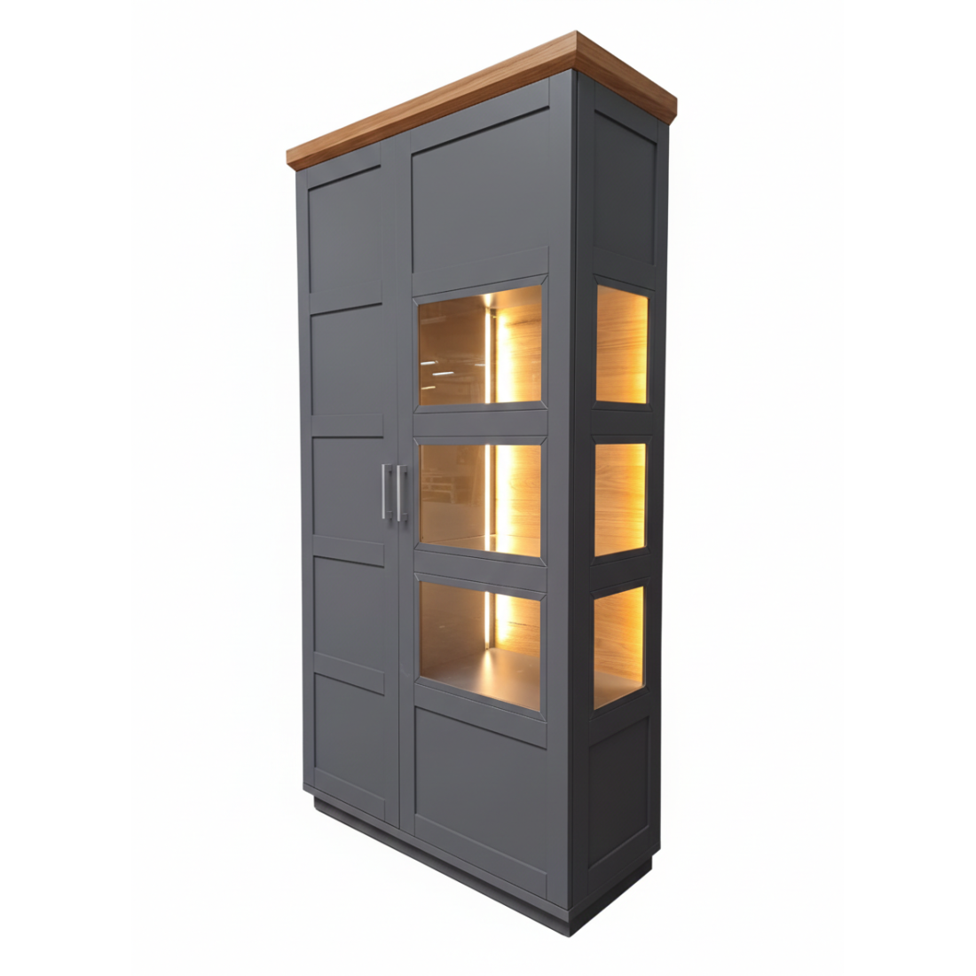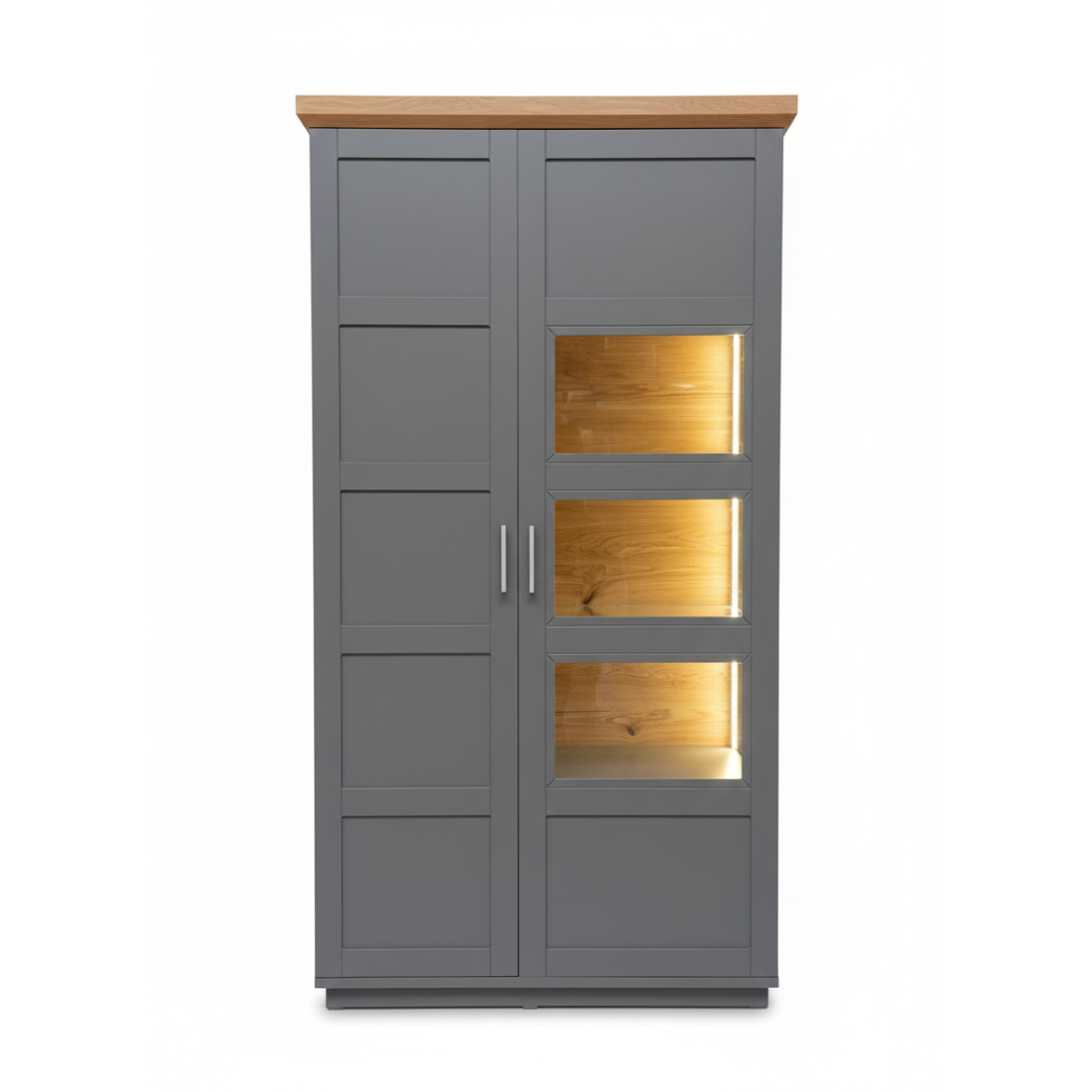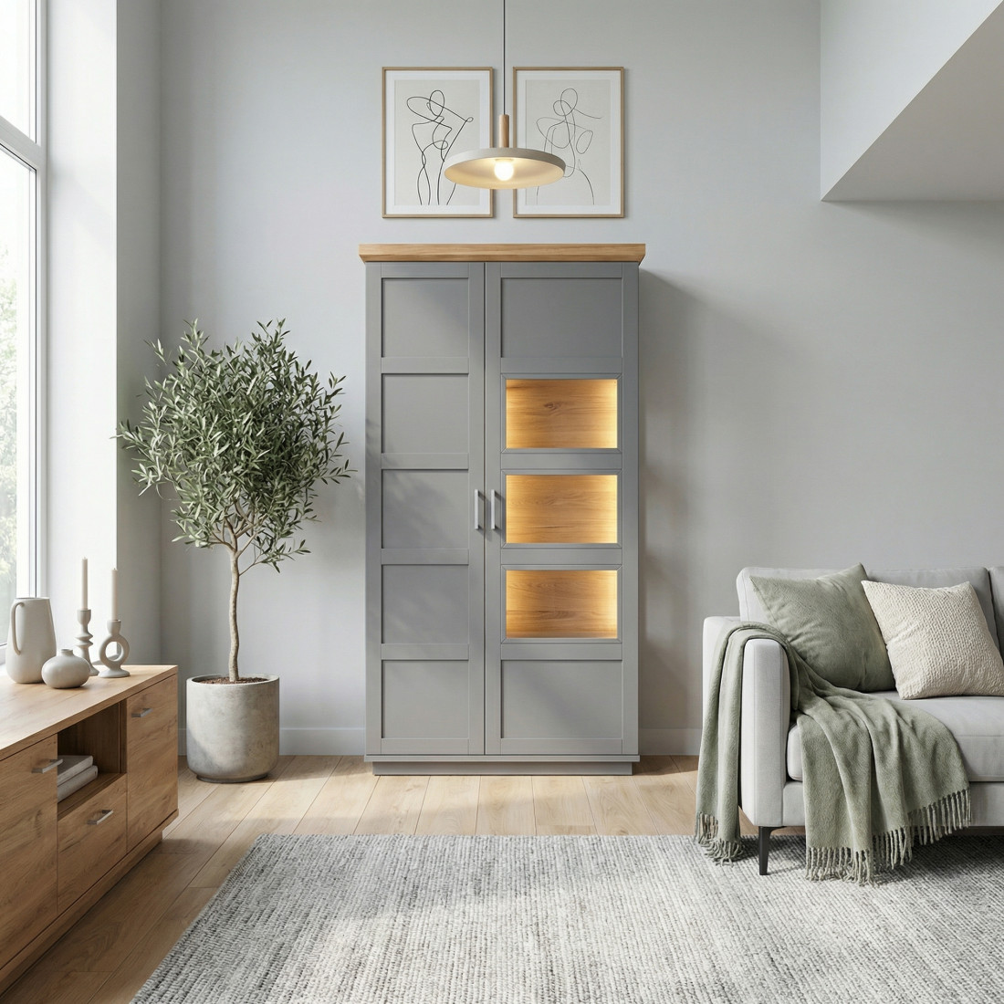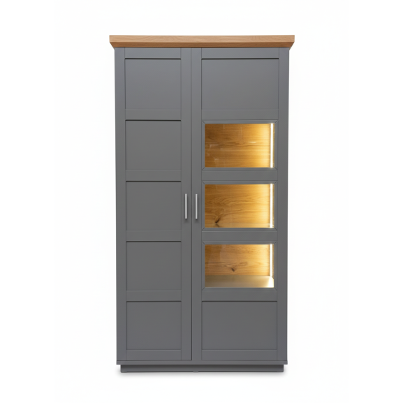 Transformă-ți livingul într-o galerie de artă personală cu Vitrina Alpina, o piesă impunătoare care redefinește stilul clasic. Finisajul gri mat oferă luminozitate, în timp ce cornișa superioară din furnir natural de stejar adaugă o notă finală de rafinament și căldură.