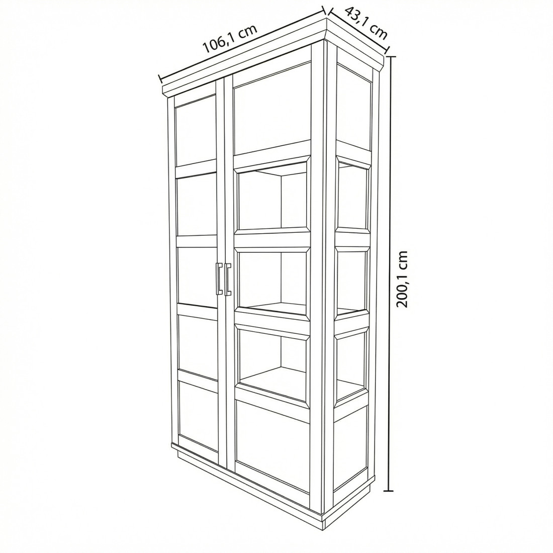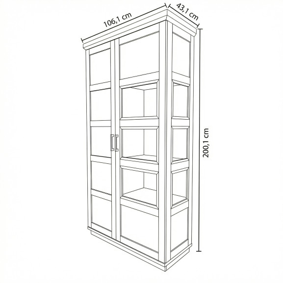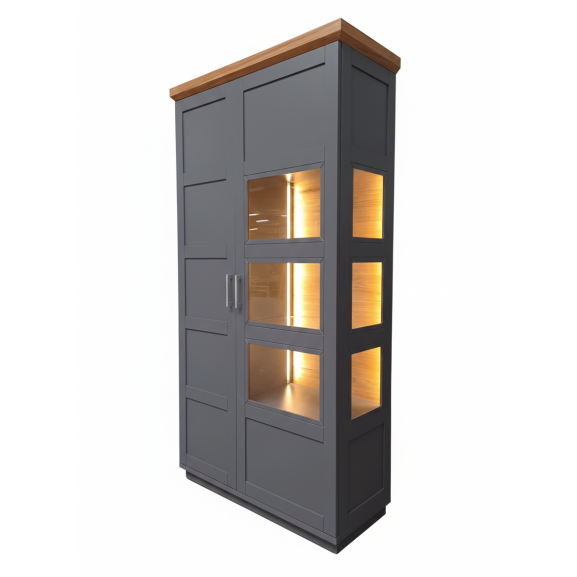 Zona de Expunere (Dreapta): O ușă vitrată care dezvăluie rafturile interioare. Elementul deosebit al acestui model este panoul lateral vitrat, care permite luminii să pătrundă din mai multe unghiuri, punând în valoare seturile de cristal sau decorațiunile preferate.
