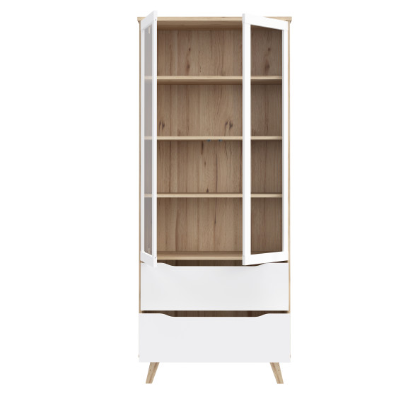 Vitrina Vankka îmbină armonios designul modern cu elemente tradiționale. Combinația de stejar pardosit și fronturi albe adaugă un plus de eleganță și contrast.