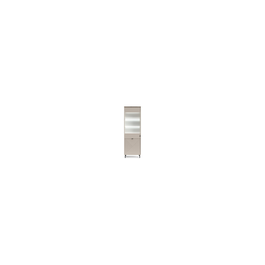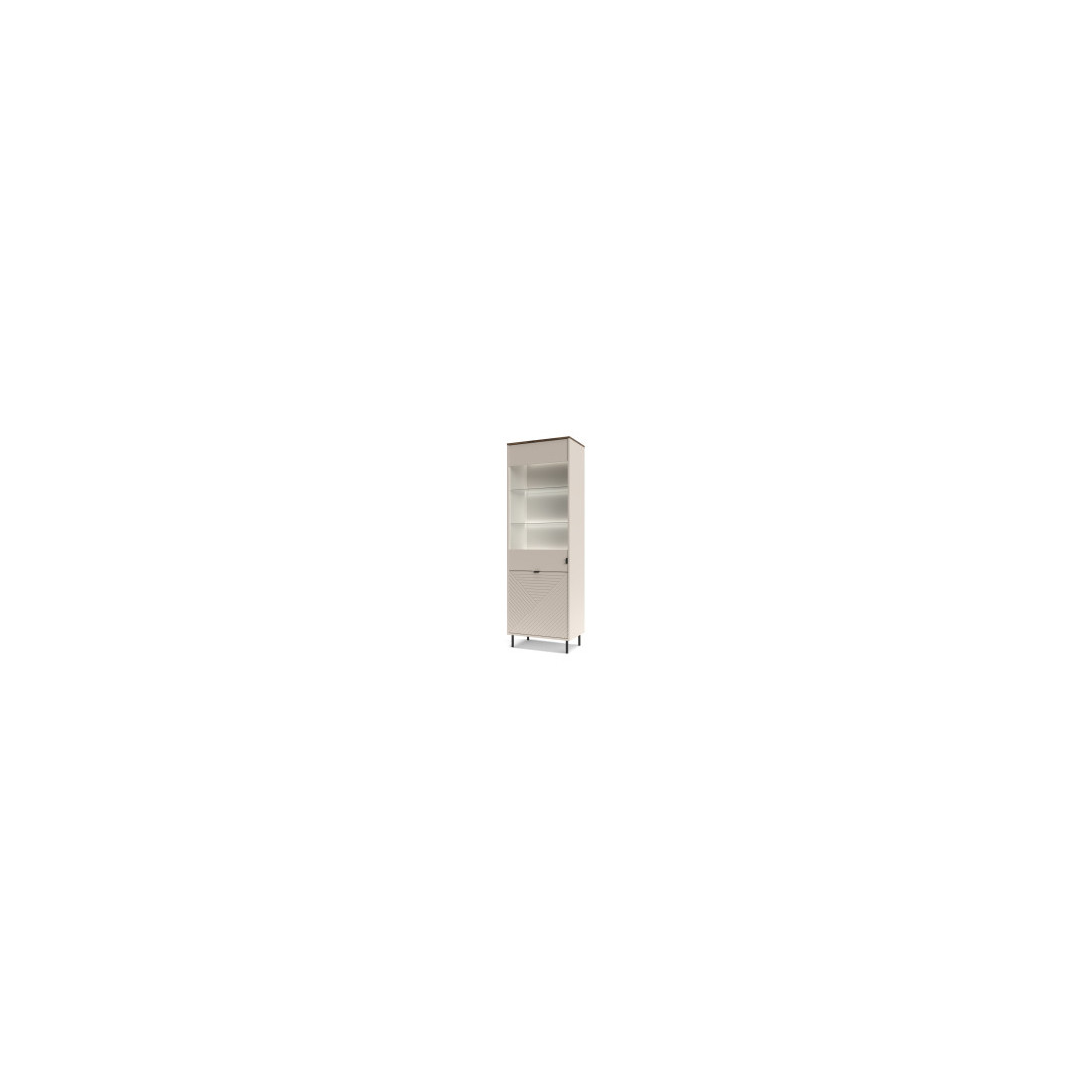 Zona Superioară (Vitrină): Ușă cu ramă Cashmere și panou de sticlă clară. Include polițe din sticlă la interior, care permit trecerea luminii.