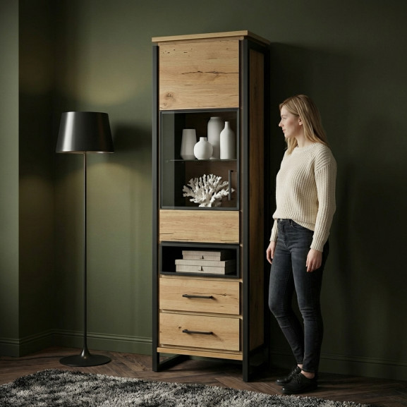 Vitrina Reno oferă spațiu generos pentru organizarea și expunerea colecțiilor dumneavoastră, a obiectelor de artă sau a pieselor preferate de decor. Feroneria cu închidere lentă nu doar că adaugă un plus de eleganță, dar și asigură închiderea fără zgomote bruște, protejând astfel conținutul și menținând o atmosferă liniștită în casă.